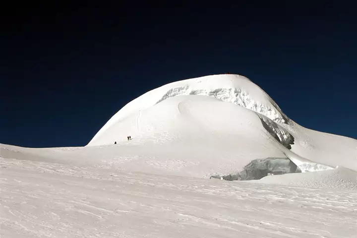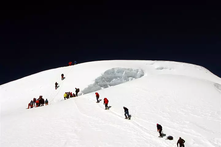 Nos despertaremos alrededor de la 1 de la mañana para comenzar a caminar e intentar llegar a la cumbre a las 5 ó 6 am. Aún no teniendo que enfrentar muchas dificultades técnicas, la ascensión tiene partes complicadas. Una de ellas está a 50 metros de la cumbre donde hay una cuerda fija para superar la última rampa de 50º.