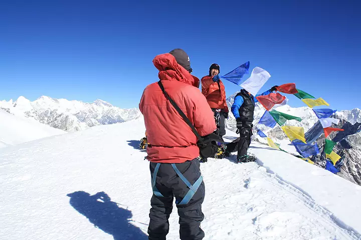 Podremos ver la salida del sol desde arriba. Una vez en la cumbre nos tomaremos unos minutos para disfrutar de unas sobrecogedoras vistas de los ochomiles de la zona. Estaremos más o menos unos 30 minutos en la cumbre para fotografías.