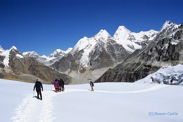 Desde Khare, trekking al campamento alto de Mera Peak (5,780 m). Ascenderemos gradualmente hacia el glaciar del Mera. El trayecto comienza con un ascenso vertical, pero se aplana al llegar a la cima del glaciar. Cruzaremos un largo plano en la cima del glaciar y llegaremos al Campamento Alto (5.780 m). Desde aquí, tendremos vistas espectaculares del camino principal a la cima del Mera Peak y sus alrededores.